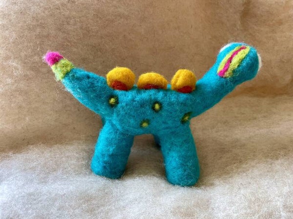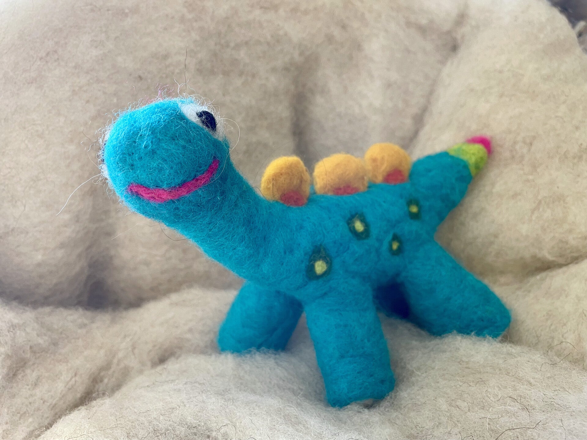 Ein kleiner Filzfreund, der Groß und Klein glücklich macht! Sorgfältig ist er aus gefärbter Schurwolle von Hand mit der Nadel gefilzt. Bunte Wollakzente lasen Kinderherzen höher schlagen. Die Größe ist auf dem Foto mit der Hand der Künstlerin gut einzuschätzen. Im Inneren des Filzdinosauriers befindet sich zur Stabilisierung ein Draht. Die Augen sind mit weißer und schwarzer Wolle in das Gewebe eingearbeitet. Ein knuffiger kleiner Kerl, einfach zum Liebhaben!
