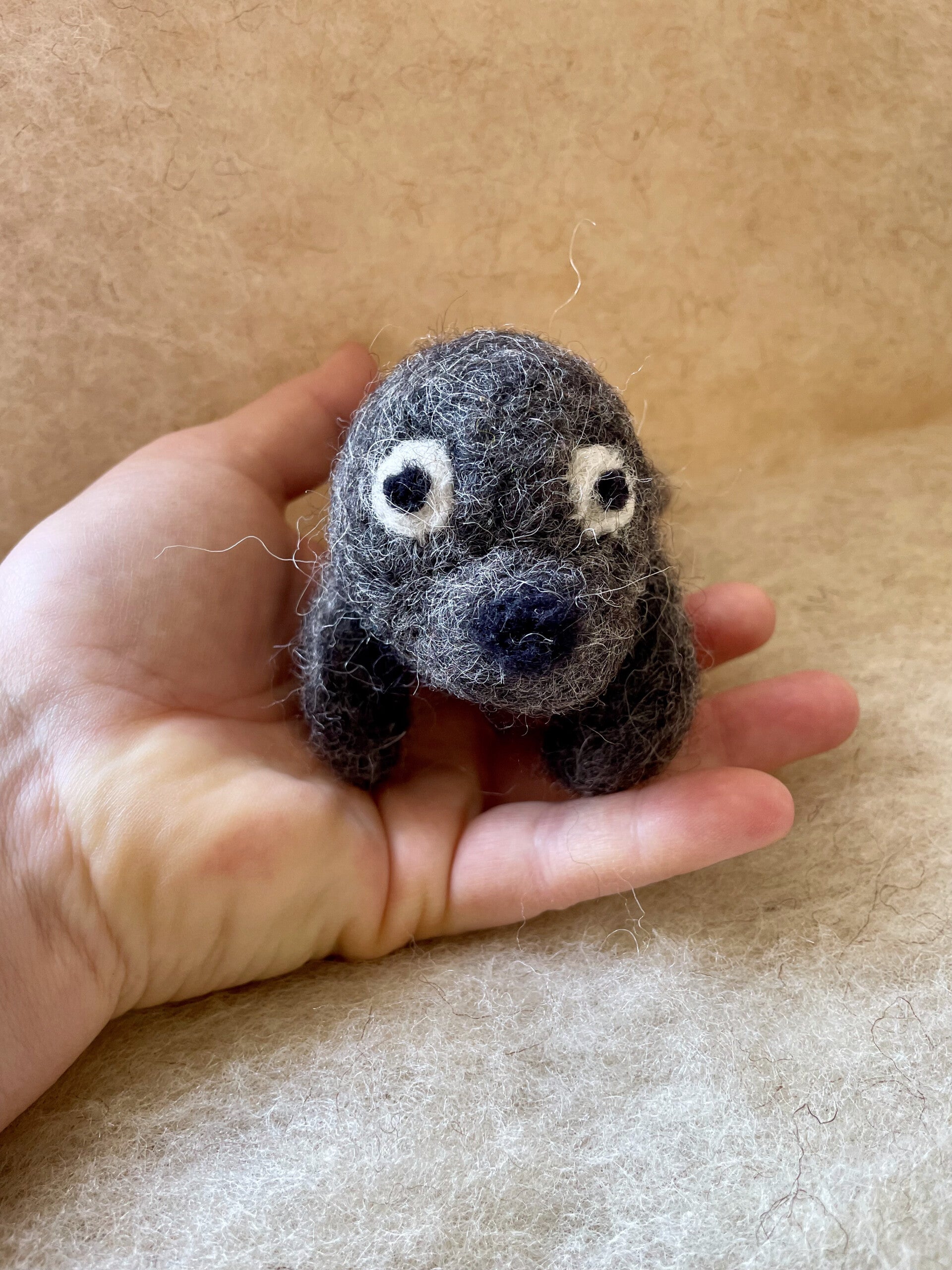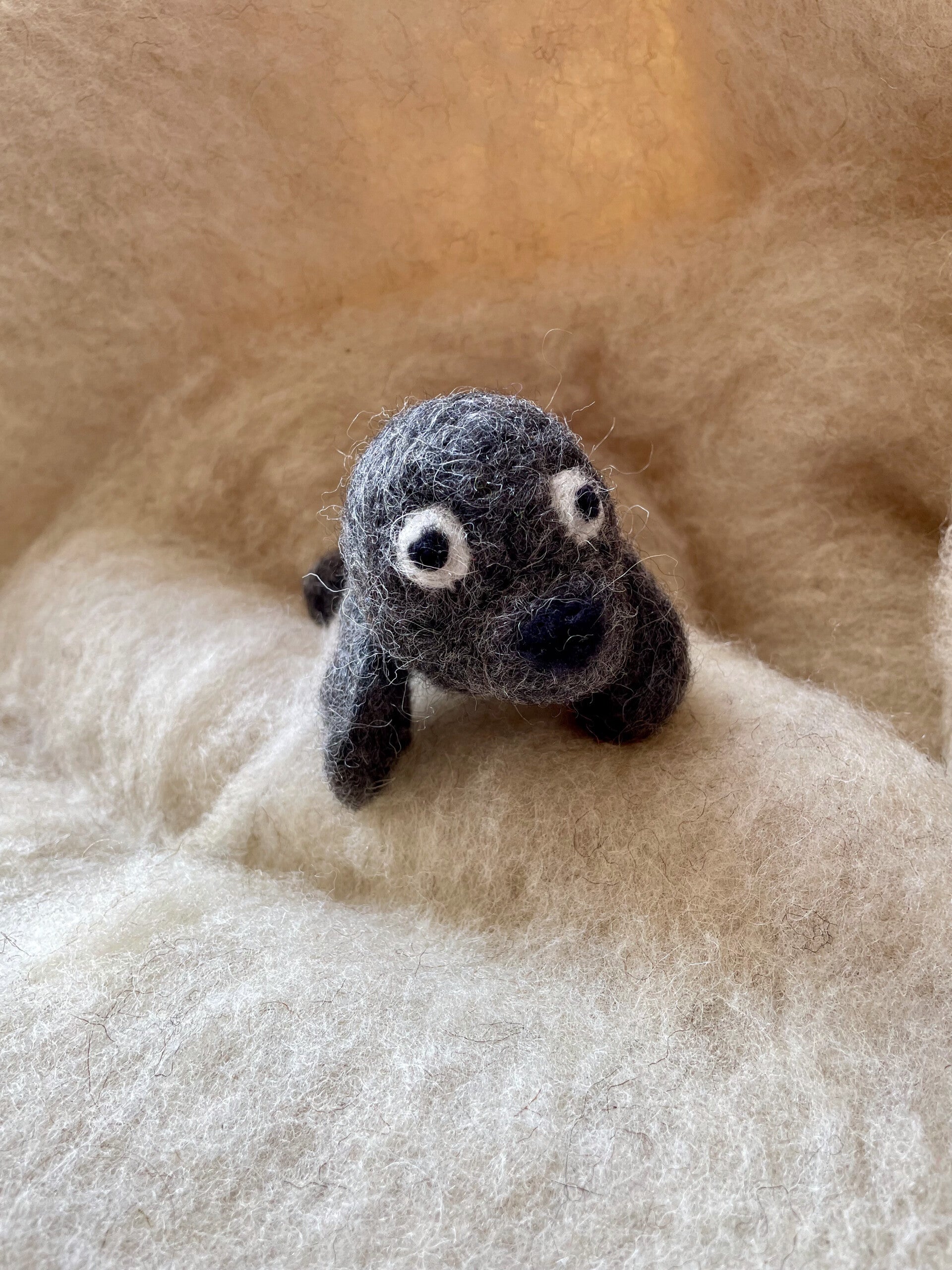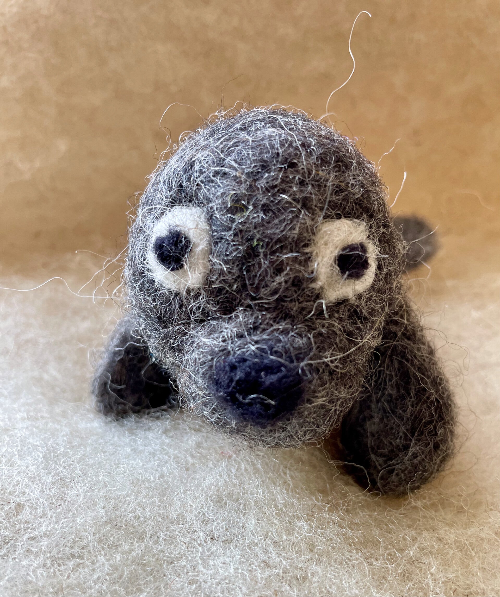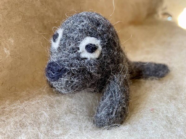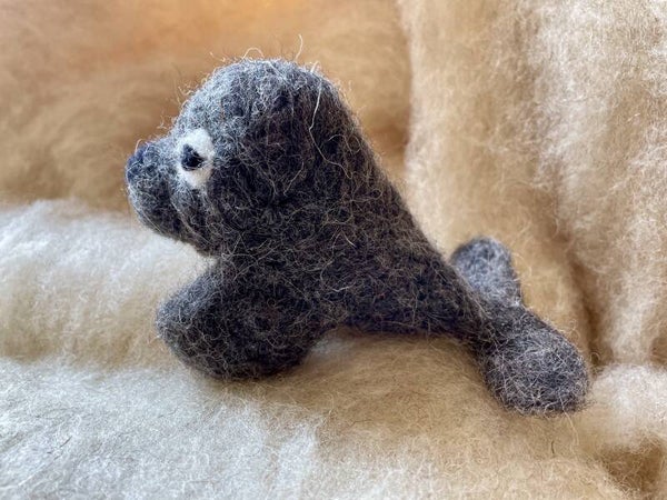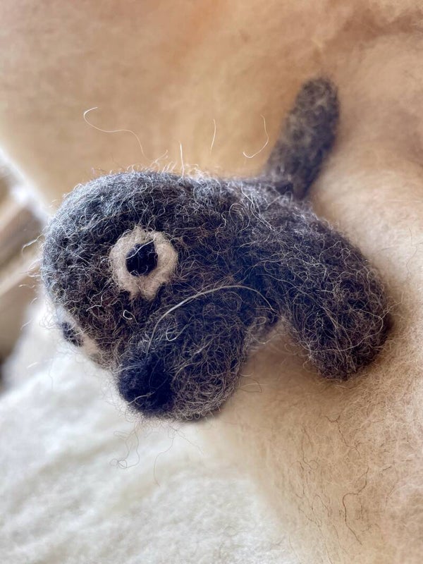 Mit Liebe und Sorgfalt ist "Robby" aus der anthrazitfarbenen Wolle des Steinschafs mit der Filznadel hergestellt. Auch Augen und Nase sind auf das Gesicht aufgefilzt, so ist der kleine Filzfreund ein Naturprodukt, das komplett von Hand gefertigt wird. Im Inneren der Figur befindet sich zur Stabilisierung ein kurzer Draht um die Herstellung zu erleichtern. Schenken Sie ein Stück Natur, das nachhaltig und vollständig in Deutschland produziert wurde. Die Größe der Filzrobbe erkennen Sie auf dem Foto mit der Hand der Künstlerin.