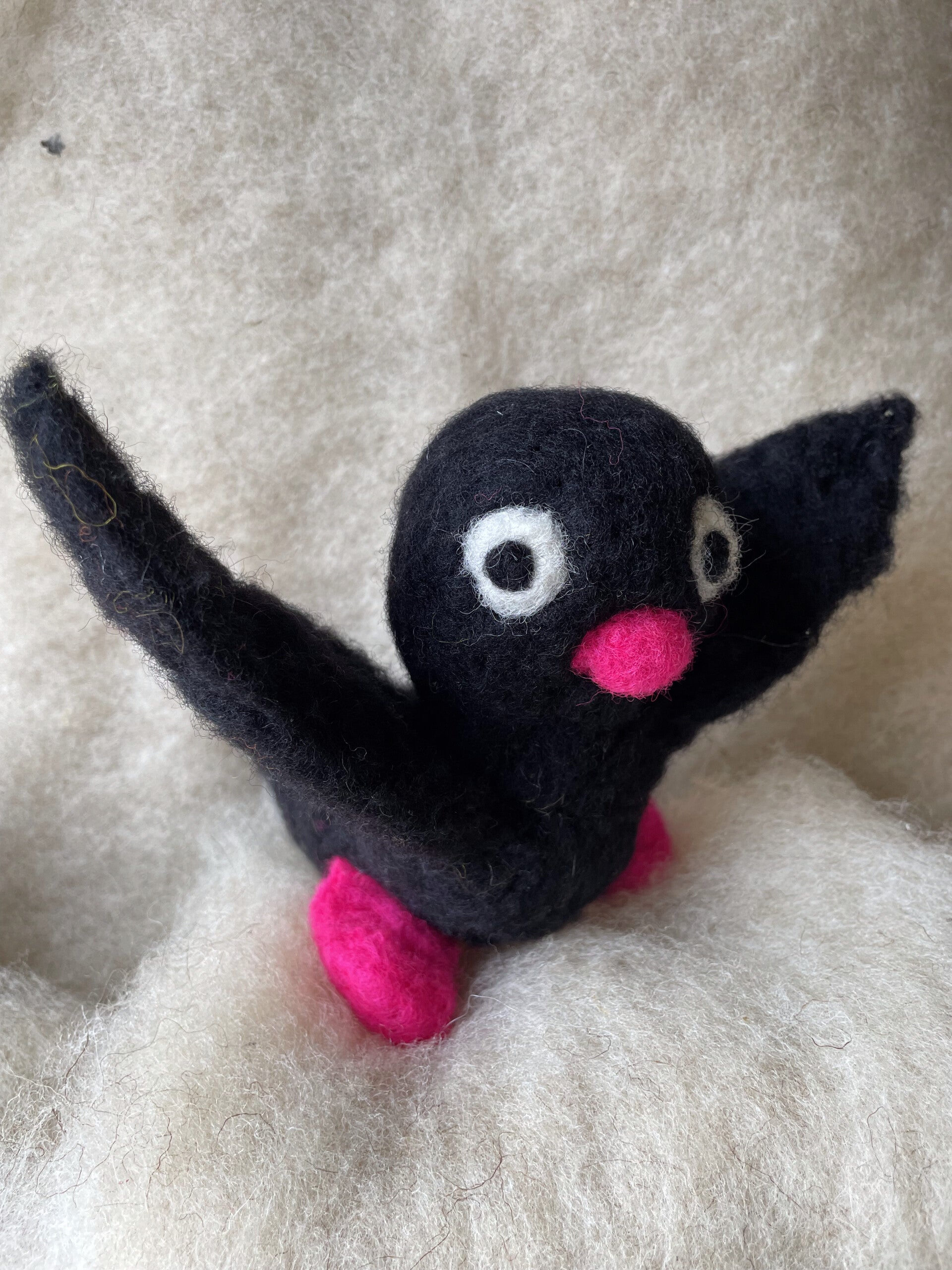 Aus tiefschwarzer gefärbter Schafschurwolle, mit pink leuchtendem Schnabel und Füßen von Hand gefilzt.